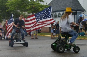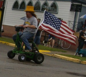 We suspect it is only in a northern Wisconsin parade that you can see men riding barstools in cheese-head cowboy hats, carrying an American Flag.