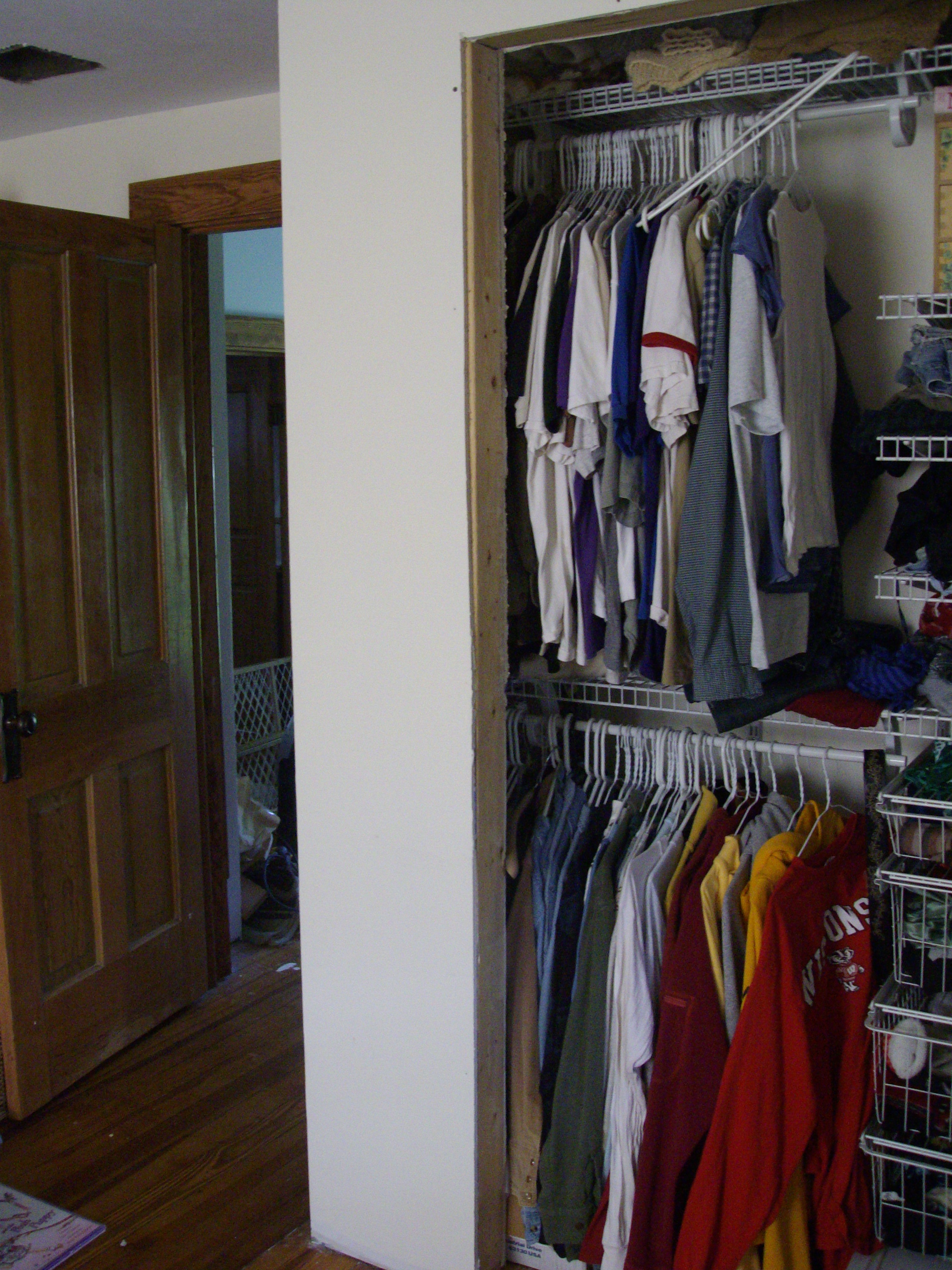 You see the summer I was five my parents built a house. When we moved in that fall we still didn’t have tile on the floor or many other finishing touches. Most of the important finishing work was completed fairly quickly, other things like closets not so much. Tyler and I each had a door-less closet in our room with holes in the walls on either side for a set of drawers to fit in. My Dad put in drawers in about five years later. When I was in middle school Dad did the drywall finishing work above them. I had been used to having the wall open and had been storing things inside next to the drawers so that the finish work walled in one of my Moms birthday presents, but that is another story. The closets never got real doors. We begged my Granny for curtains that are still hanging today. My point is that I knew that if Clara moved in before her room was done the odds of us ever finishing it would plummet. And the odds, lets just say it’s looking pretty ugly…