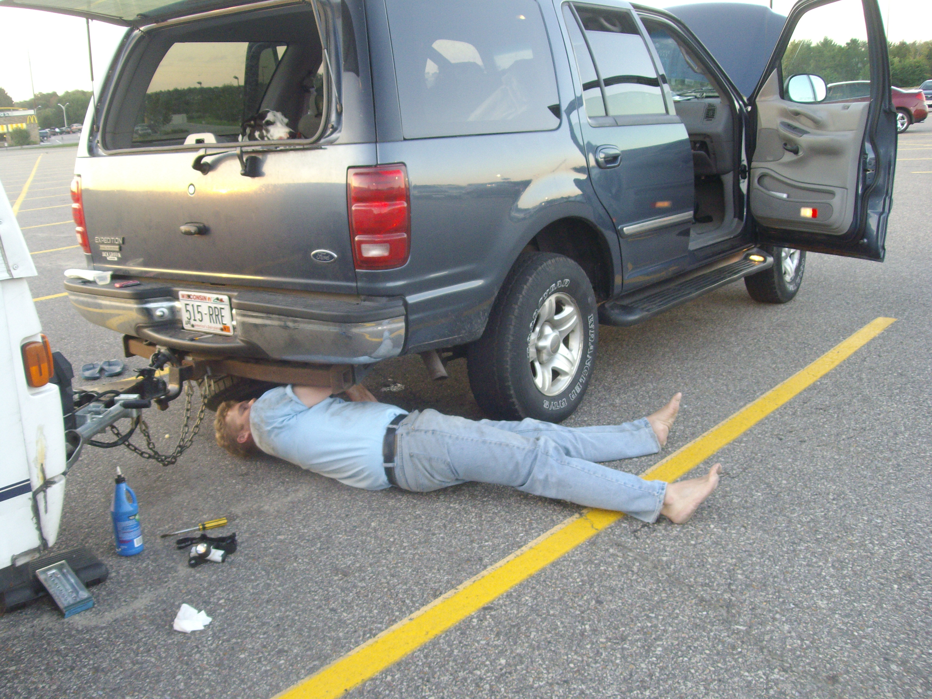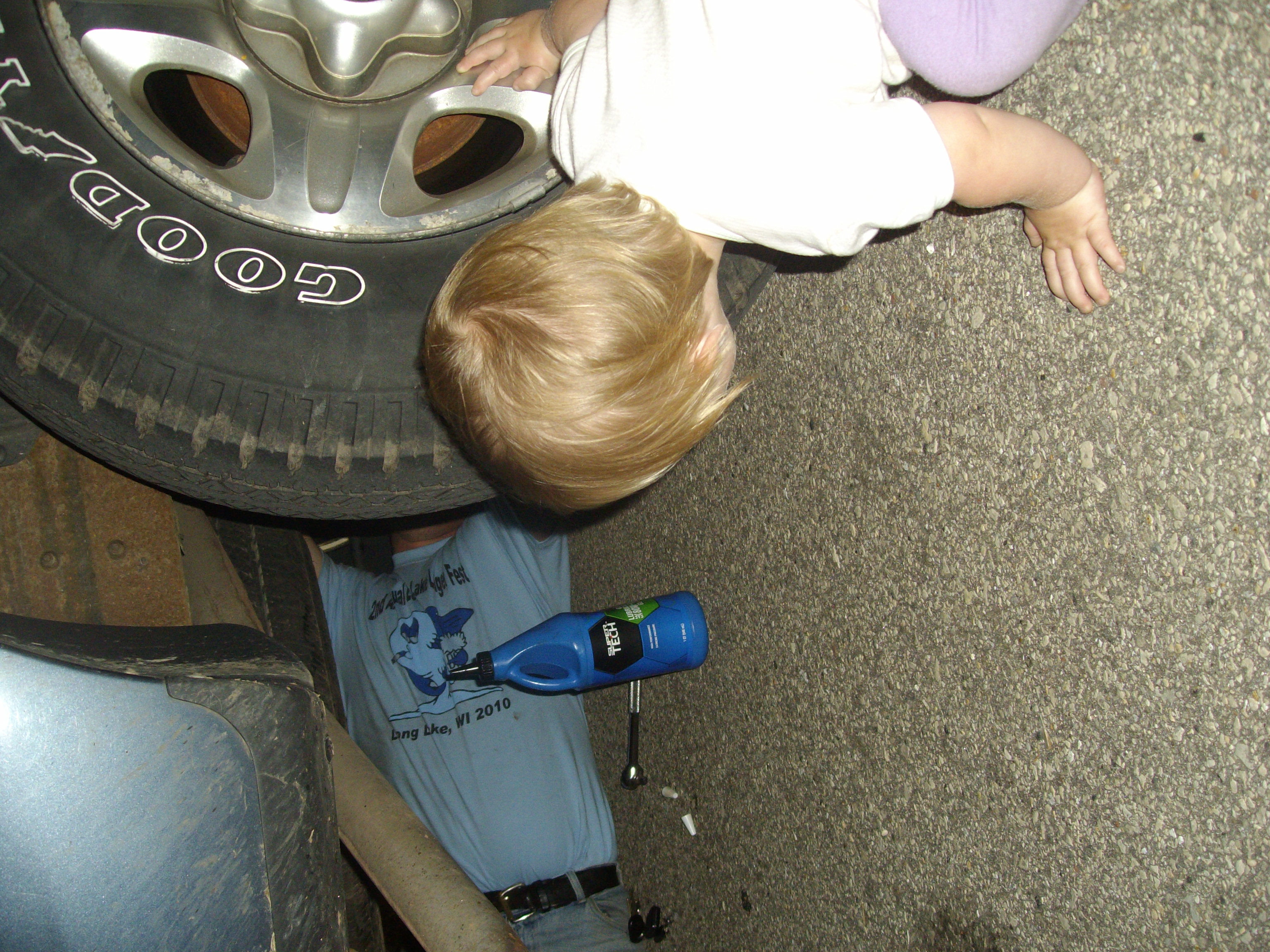 Back at the truck John had patted himself on the back for bringing a few tools along and crawled under the truck.  I set Clara  up playing in the back with Piper (who was completely unfazed by the whole ordeal, I’m not sure if it’s because she is the best dog ever or if it’s because we never made her get up from her comfy position in the back of the truck) and attempted to feed her (Clara that is not Piper) while helping John. My job was to find random items in the truck that John would call out and then throw them under the truck.   You know stuff like: the phone, a socket, a pen, a headlamp, paper towels, baby wipes,  a thing that looks like the square part on this but sort of smaller,  I admit he had to crawl back out for the last one, but I was able to handle the rest.  A mere two hours after getting to Wal-mart he crawled back out from under the truck and said we were ready to go.