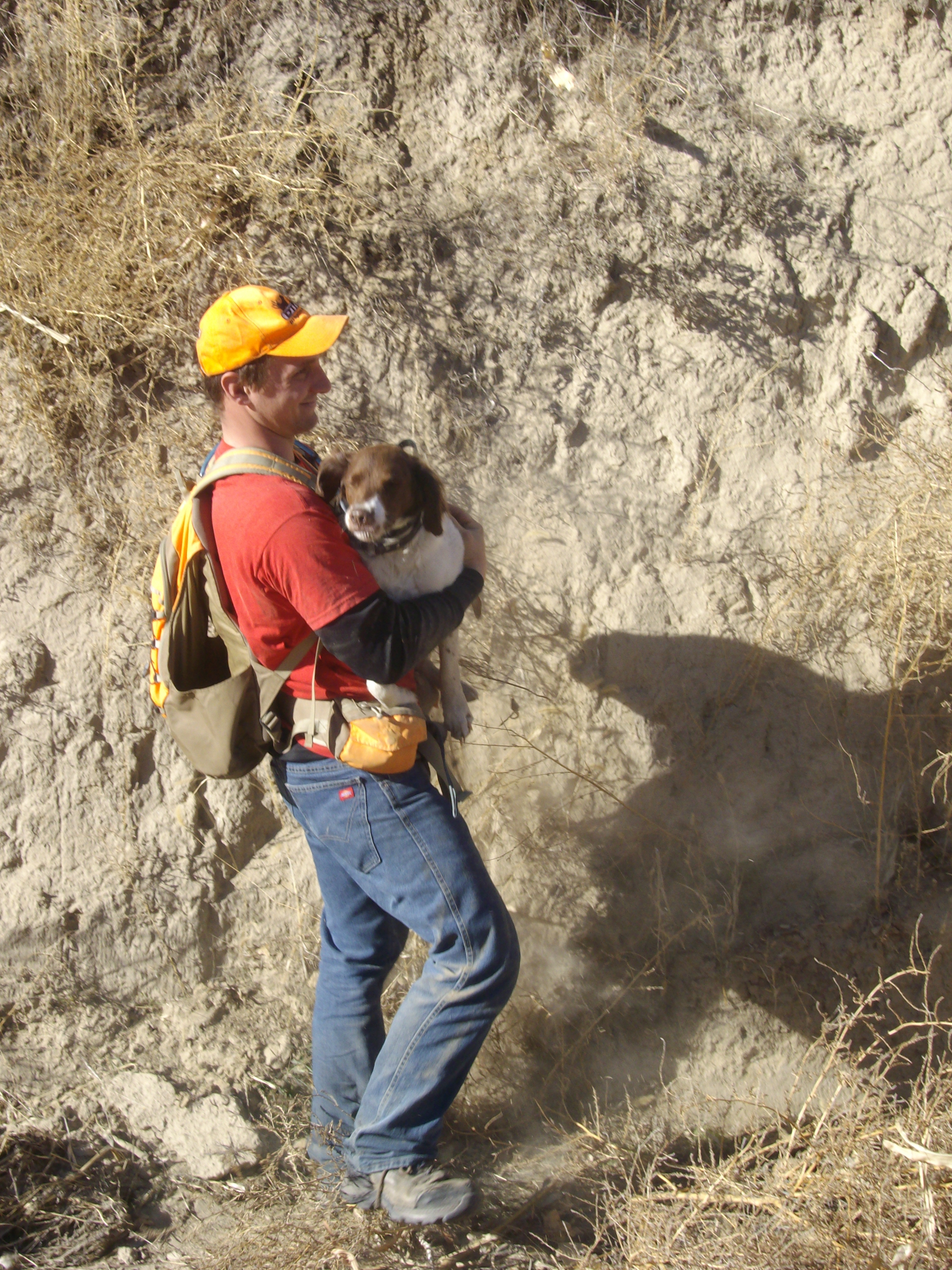 The English Setter is Misty, she spends the first few minuets of every hunt looking for my Dad, her main hunting partner, when she resigns herself to the fact that she’s stuck with us she’s wonderful to watch in action as she sneaks up to birds. Too busy hunting to be caught in a picture this is the best we’ve got of her this trip. Misty is the white dog starting at Tyler willing him to get up and keep hunting.