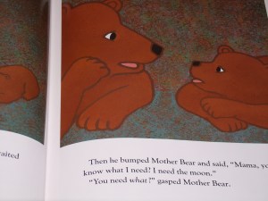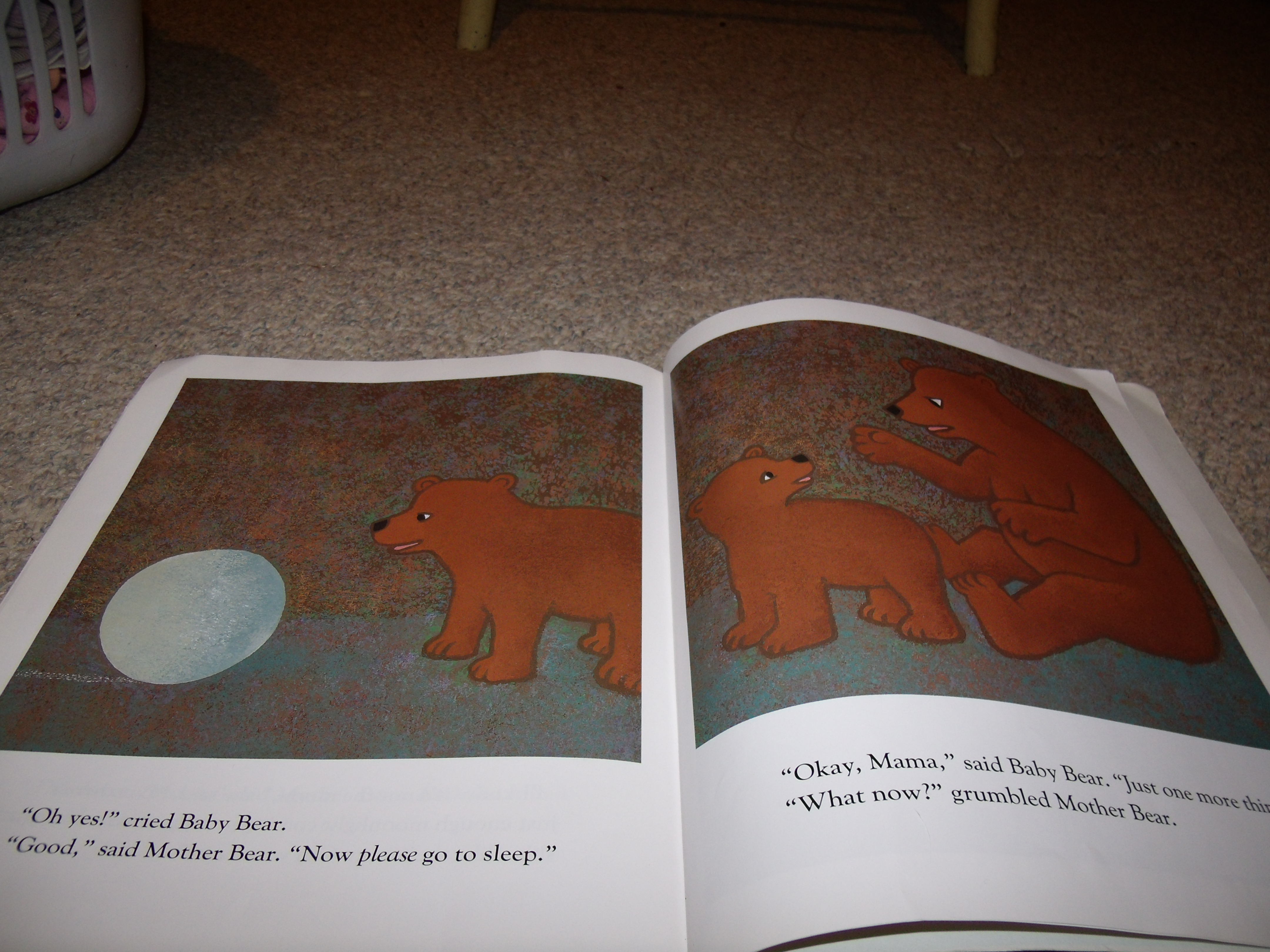 The book is good, when Baby Bear asks for the moon and Mother Bear says “You need what?” It was like the book was written from a conversation between Ivy and I.