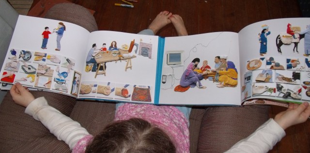 The book follows two boys, (the boy on the left lives in Sydney Australia and the one on the right lives in Morocco) as they go about their day.