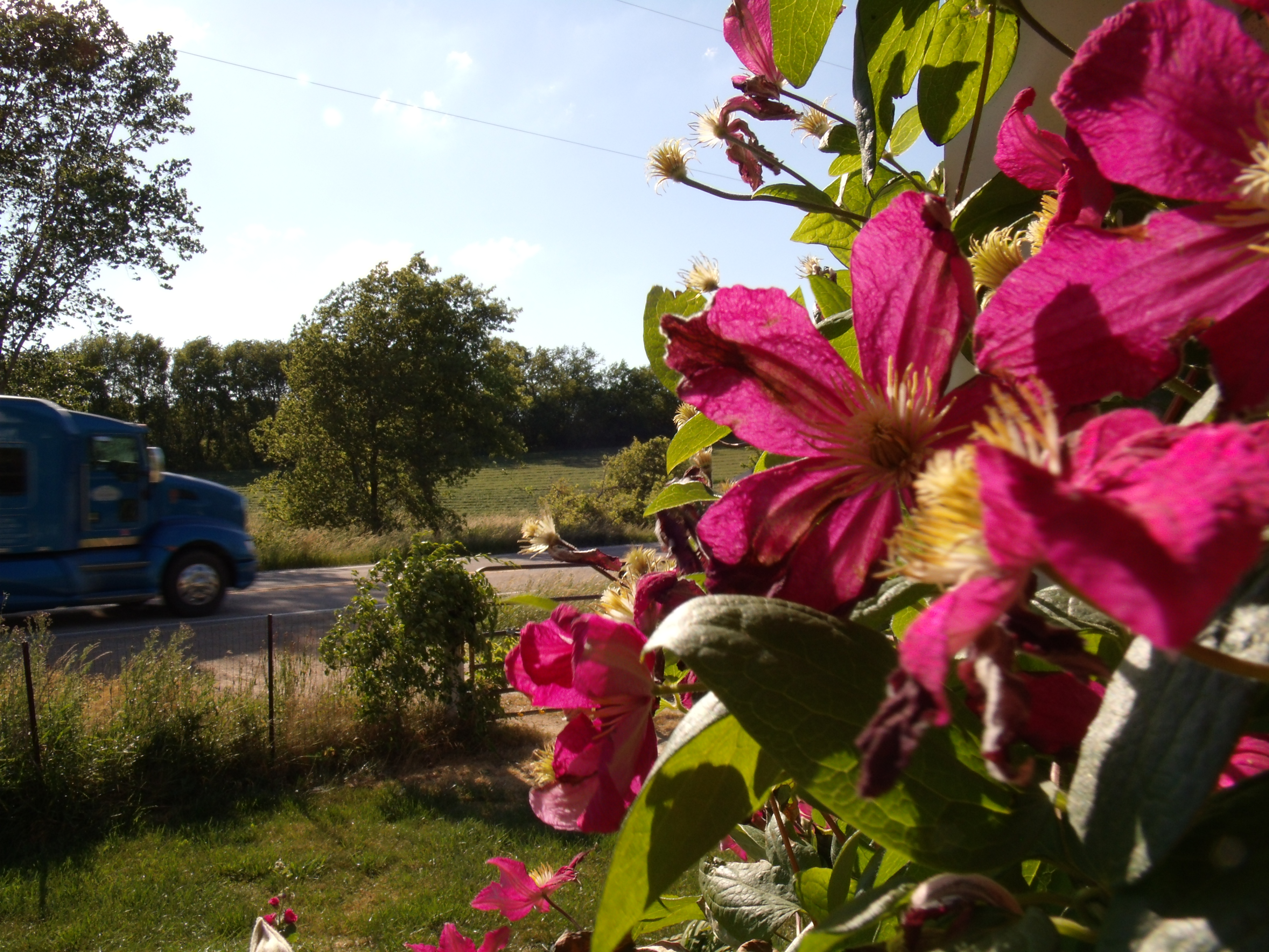 In fact the house is close enough to the highway that a split second after the photo was taken the wind from that big blue semi blew the flowers around.
