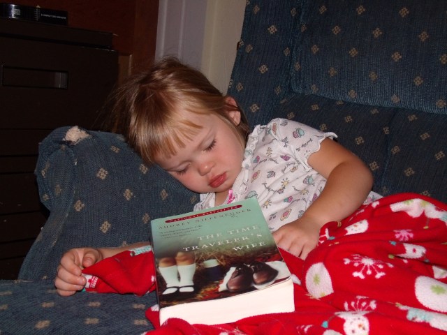 Once upon a time things were much different around here. I had one dog who liked to sleep all day, no job, a new husband who worked first shift and on this particular day a good book.  I woke up early to kiss my hard working husband goodbye, layed down on the couch ( we don’t have one of those anymore either) and started reading The Time Travelers Wife. Many hours later he got home from work and I was still laying on the couch saying “shhh don’t talk I only have a few pages left!” Ever since when ever this book comes up John tells about how he went to work with my reading it on the couch and how I was still there when he came home.  Which is clearly ridiculous, I’m sure I got up to eat and pee at least once while he was gone.