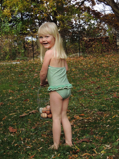 I suppose one could call out to the three year old with the dozen eggs traipsing around outside in nothing but her swimsuit on a chilly October day to be careful.