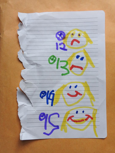 This is clearly a time line to happy. At 2 o’clock Jane is sad because we bonked heads and yelled at each other and she will slowly get happier until 5 o’clock when she is back to being extra happy. I know this because she told me.