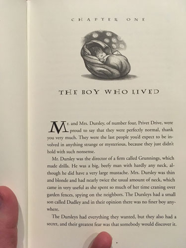 I love my HP books. I will not embarrass myself by saying how many times I’ve re-read them. 😀 … what edition do you have with that lovely chapter heading illustration?