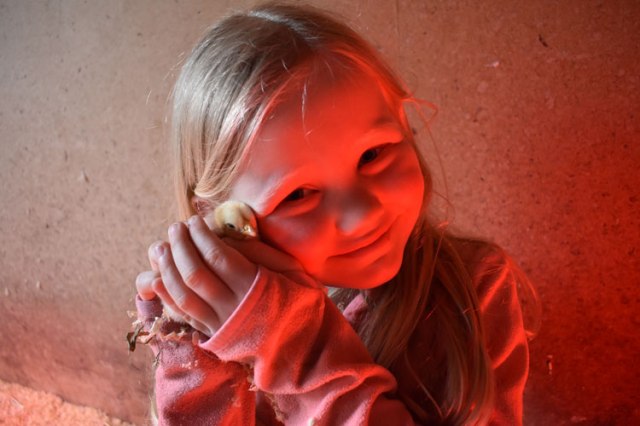I hustled back out to the brooder house. Sure enough, the door was locked from the outside. I opened it up and went in, bracing myself for yelling and crying and wondering if my apologies would have to go as far as promises of ice cream and movies. There were Clara and Jane, lounging under the heat lamp. Jane had a half a dozen baby chicks sleeping on her lap, Clara had a few more along her legs and one tucked under her hair, resting on her shoulder. Clara just looked up at me and said in a voice usually reserved for teenagers, “Really Mom?