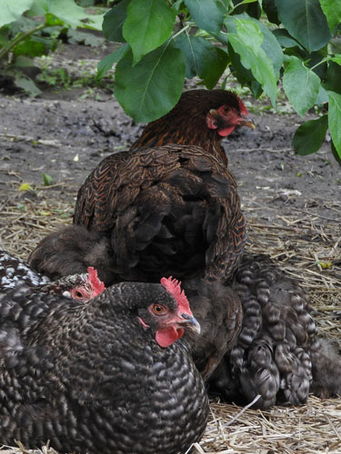 I’m not exactly sure what goes through a hen’s brain as she walks around doing her chickeny things but none of it seems to have to do with awareness of surroundings and self-preservation. It’s possible the chicken crossed the road because the rooster wasn’t around to tell her it was a dumb idea. While the hens are happily meandering about, the rooster (the current one goes by name of Roosty) is on guard duty. A hawk flies overhead and the hens continue to scratch at the ground – until Roosty (yes, the kids named him) spots it. He’ll give an alarm call and quick as a wink the chickens all vanish under bushes and whatever else they can find, and hunker down until it’s gone. While we’ve lost chickens to hawks between roosters, we’ve yet to have them get one since Roosty’s been on the job!