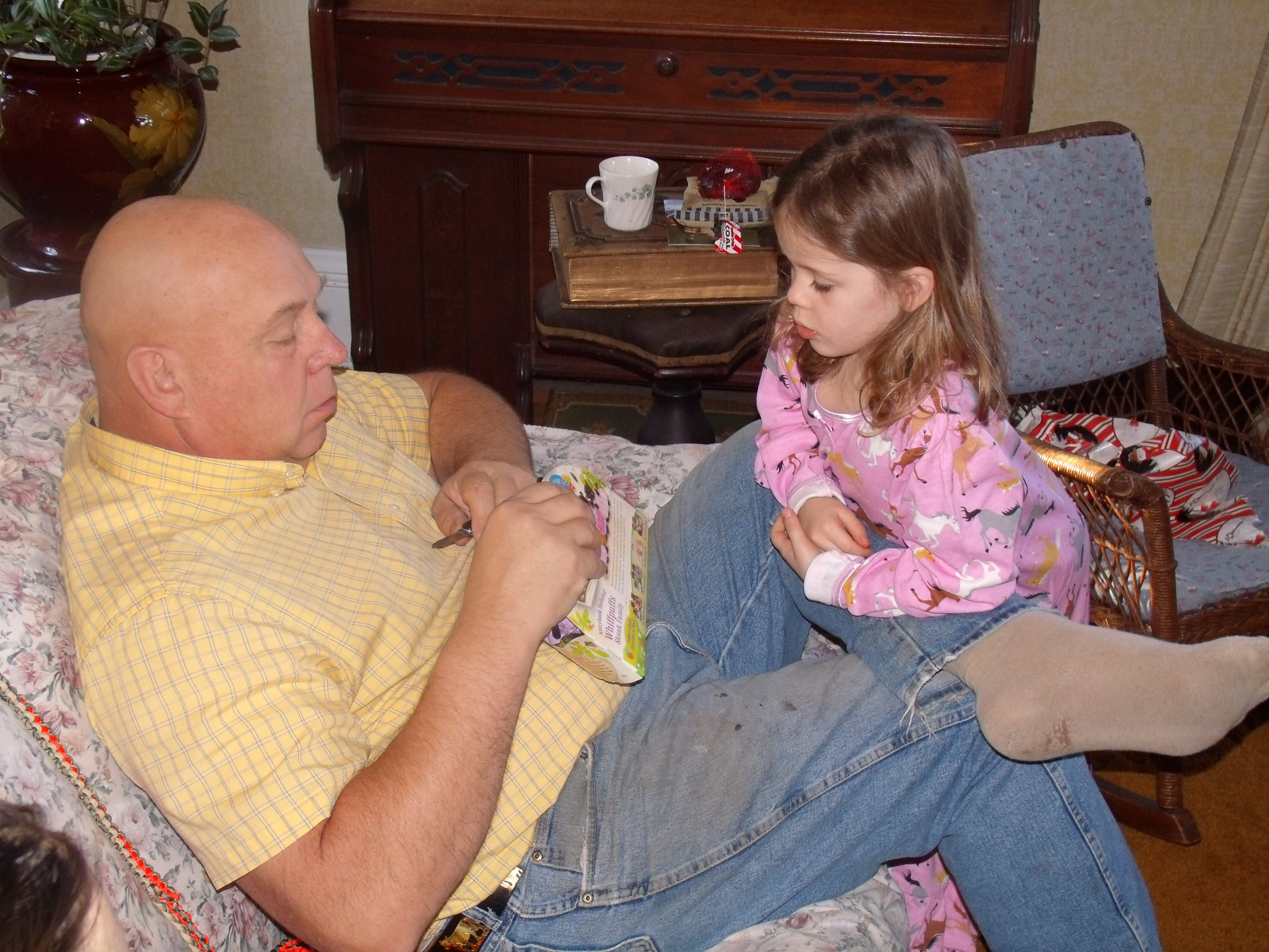 First off, lets just say that nothing is very low key with a four year old, a two year old, a newborn, and a sleep deprived set of parents… and don’t forget the puppies. While most of the dogs spent Christmas down at Mom and Dad’s by themselves, the puppies, who are fast approaching the six-month old crap head stage, were with us at the big house. You know the Family Circus cartoon? The ones where they show the tracks that the kids make as they run all over? Well Tyler’s dog Sunday would fit right in… you get him too excited and he leaves his own spotted trail behind him…all over the front steps, your foot, your cousin’s pants…. Between Sunday’s Family Circus trails, Clara’s potty training and Jane just doing what a newborn does, it was a soggy sort of Christmas.