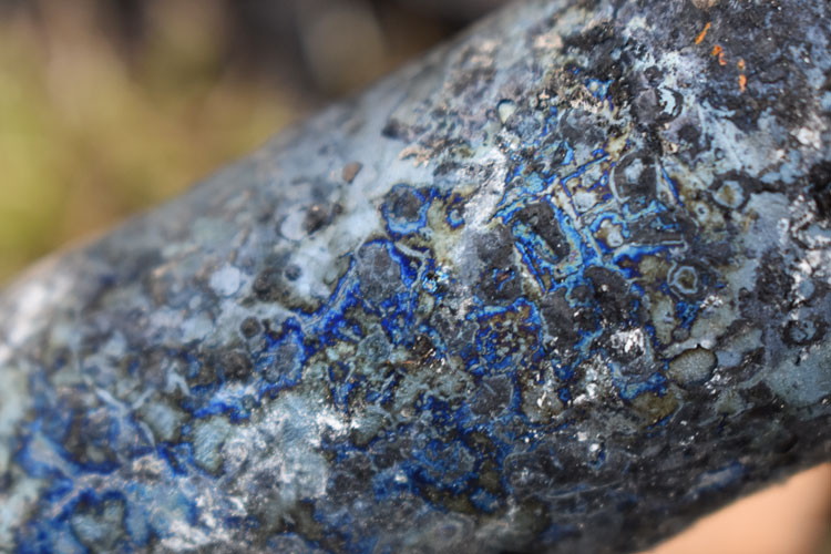 This is a close up shot of a shovel that had been at the bottom of a fire. (It was thrown in to burn out the handle that had broken off inside.) When I pulled it out the next day I found this brilliant blue color on parts of it!