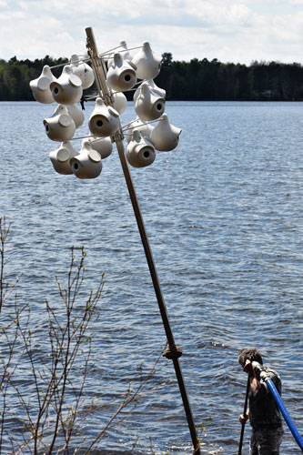 You see the cabin is on a flowage and on years that the water is high, the base of the martin pole is underwater. The martins don’t mind. In fact since they have eschewed the identical set up on land for many years in a row, I’d say they prefer it that way. Perhaps they just like to watch us squeal when we wade out to crank the whole colony down and check the nests when the water is cold and the wind is high.