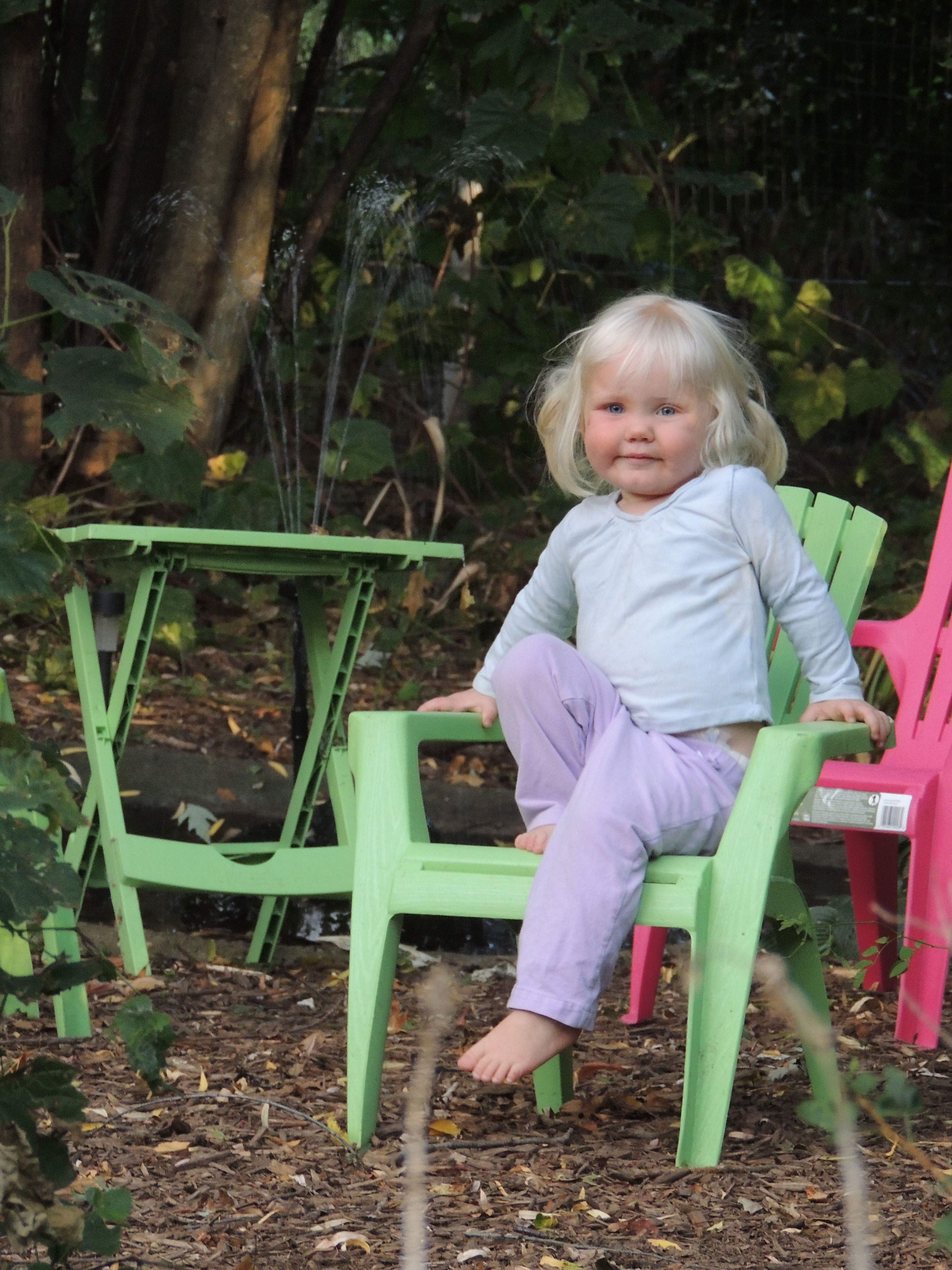 You’ll have to talk and walk though. Past a few flower beds and across the very small lawn Jane is waiting to show you her new chair and the goldfish in the tiny pond behind her…